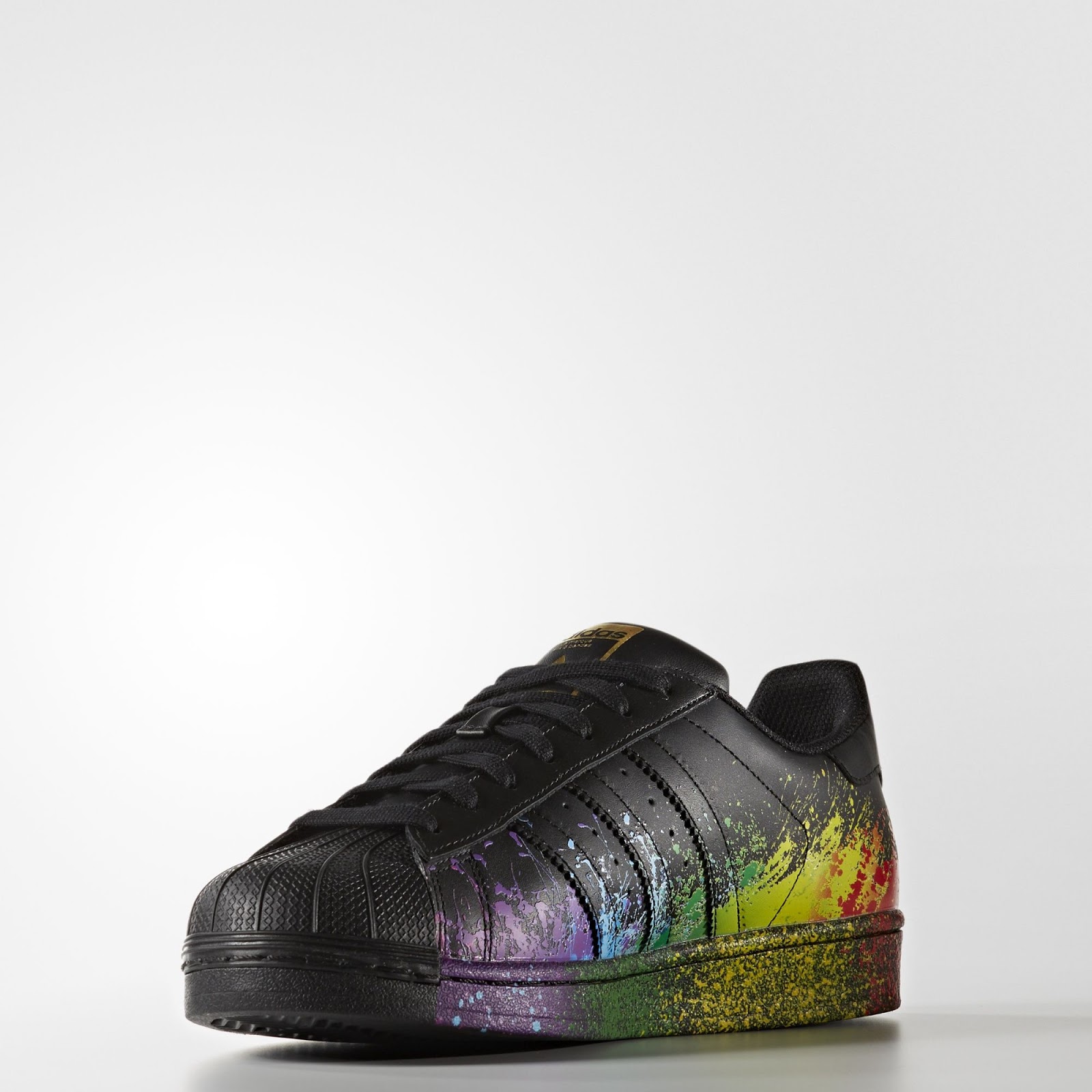 Schon letztes Jahr konnten wir während der Berliner Fashion Week den einen oder anderen Besucher mit der weißen Version des Adidas Superstar Pride sehen, der vor allem dadurch hervorsticht, dass er mit Regenbogenfarben besprenkelt ist. Nun kommt Adidas Originals mit einer ganzen Kollektion heraus, die neben einer weiter Superstars Version in schwarz auch noch T-Shirts, Trainigshosen, Jacken und Caps beinhaltet. Alle Teile sind aktuell z.B. direkt im Adidas Online Store erhältlich.